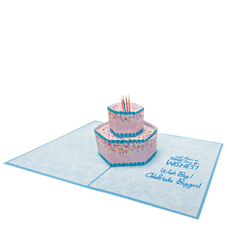 “The pop up cake and candle makes it special and unique! The front of the card is very pretty with glitter. The inside has the nice pop up cake effect with candles and nice short message. “